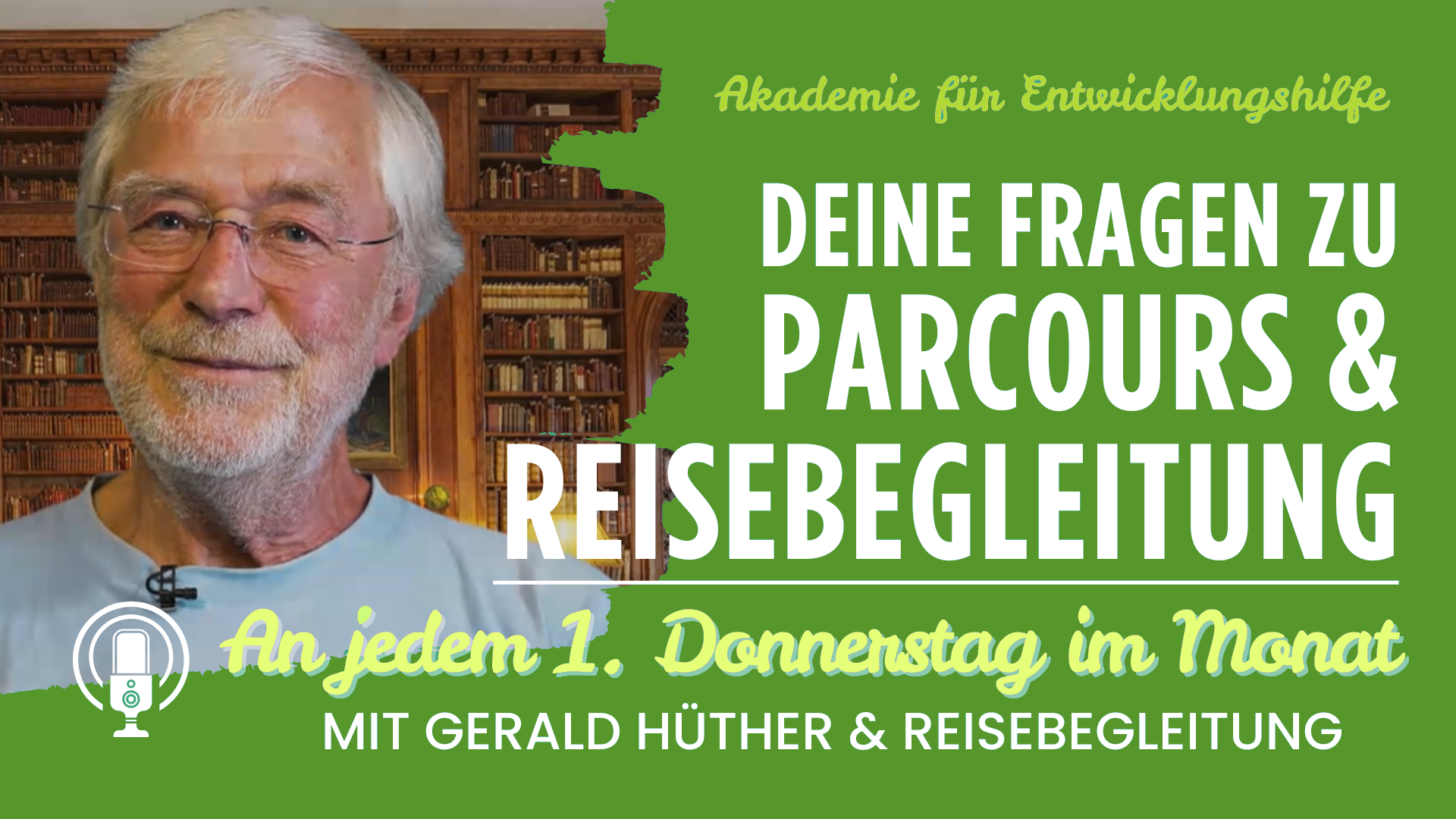 Im Rahmen eines einzigartigen Online-Kurses zur persönlichen Entwicklung mit Prof. Dr. Gerald Hüther, unterstütze ich dich gerne als „Reisebegleiter" auf deinem Weg der Entwicklungsreise.